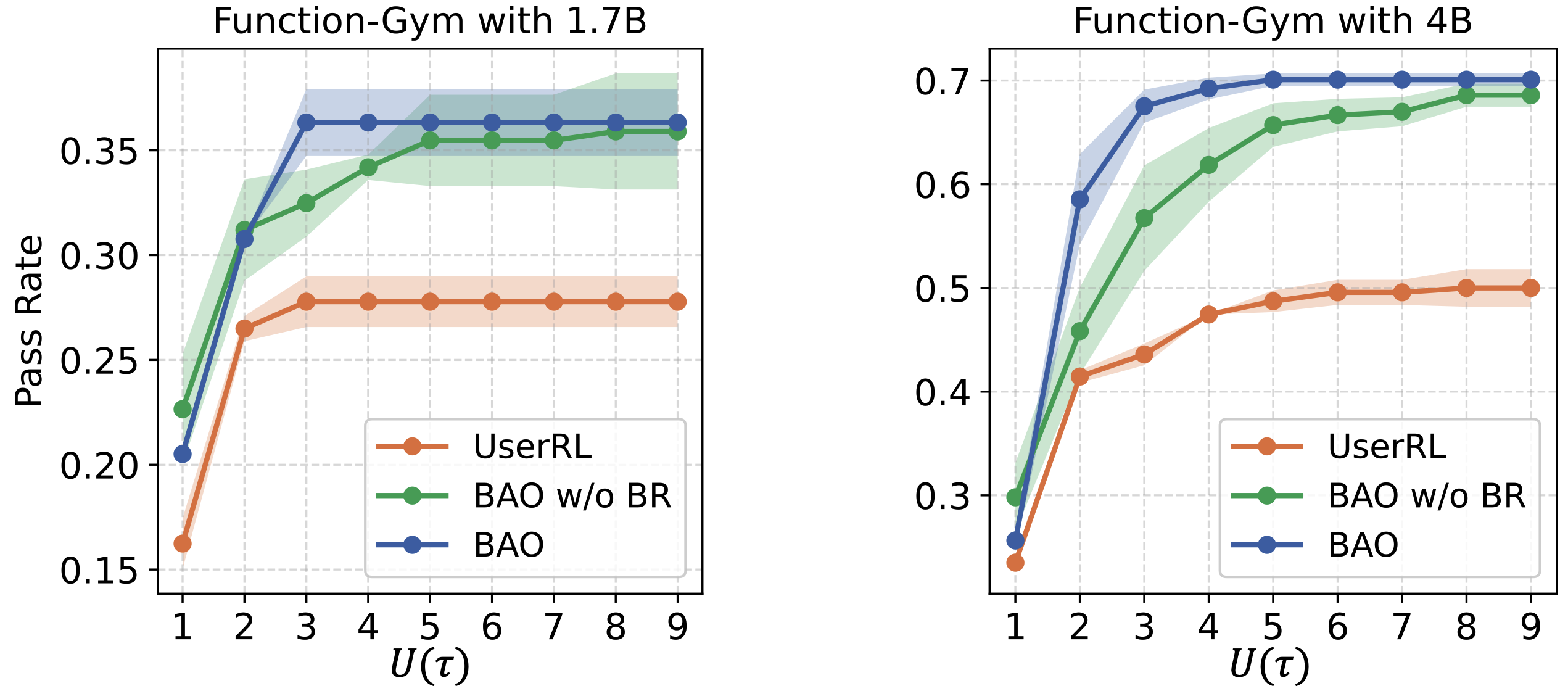 In contrast, BAO consistently achieves higher Pass@U-1,2 with a much lower action rate, reflecting greater confidence in early answers and reduced reliance on user feedback. BAO also matches or outperforms frontier models, especially on Function-Gym, where the 1.7B model surpasses GPT-4o-mini and the 4B model outperforms GPT-4o in score.