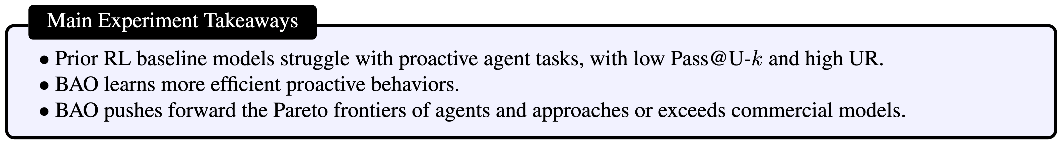The Pareto Frontier of RL-trained proactive agents are visualized in Figure 4. We can clearly see that BAO learns more efficient proactive behaviors, and pushes forward the Pareto frontiers of agents with a significantly high performance increase rate when receiving more feedback information from users and a higher upper bound of performance when working with users.