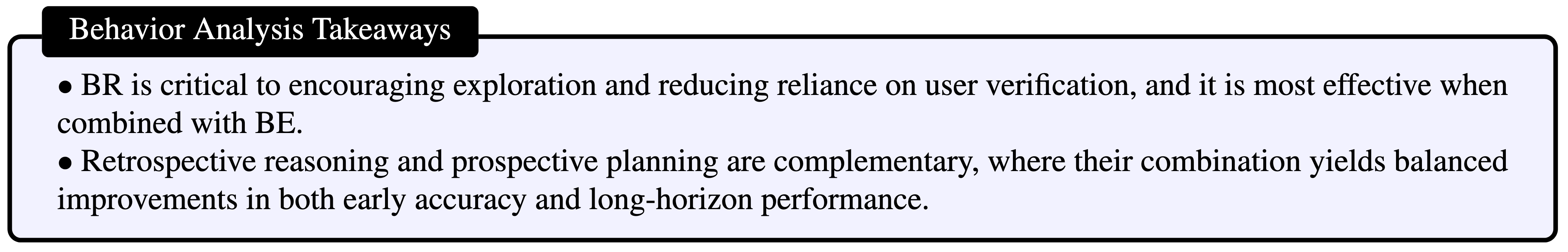 Behavior Analysis. How does Retrospective Reasoning and Prospective Planning behaviors contribute to the overall performance? We conduct an ablation study by controlling the enhanced behavior types included in the SFT dataset. The results are visualized in Figure 5.