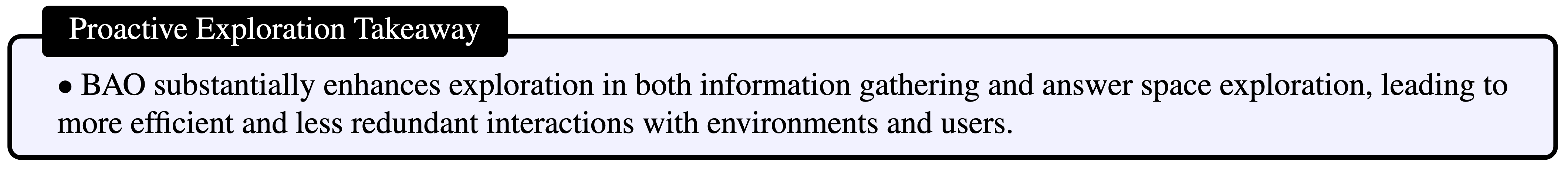 Proactive Exploration. How does BAO improve information collection strategies and hidden context exploration? We analyze exploration capability through two forms of diversity: diversity in environment queries, which reflects how effectively the agent collects information from the environment, and diversity in answer submissions, which captures the agent's ability to explore alternative reasoning paths after receiving negative user feedback. We utilize self-BLEU score and embedding similarity of the NV-Embed-v2 model to analyze the diversity. The results are presented in Figure 6.